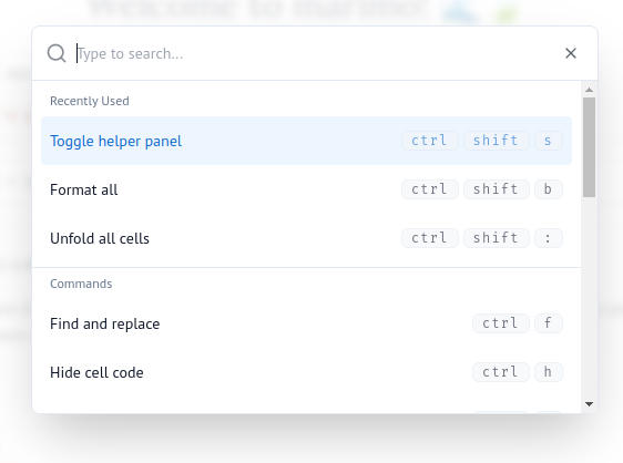 We’ve kept some well-known keyboard shortcuts for notebooks (Ctrl-Enter, Shift-Enter), dropped others, and added a few of our own. Hit Ctrl/Cmd-Shift-H to pull up the shortcuts.