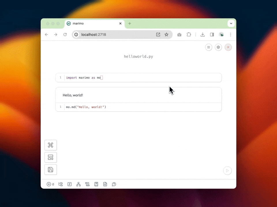 marimo supports context-sensitive right-click menus in various locations of the editor. Right-click on a cell to open a context-sensitive menu; right click on the create-cell button (the plus icon) to get options for the cell type to create.